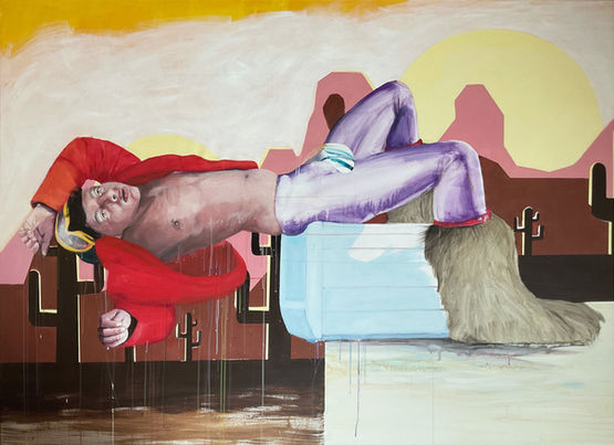 Nicole Henning is a visual artist who sources fragments from the internet and her photo archive, including scenes from consumer culture and the leisure industry, and arranges them into complex backdrops. These backdrops form the setting for painterly stagings, dramas and games in which various protagonists appear, blend into their colourful surroundings and become part of the object world that surrounds them. Her mise-en-scène deals with the complexities of a modern world in which simulated realities and constructed world views prevail, and emphasises the role of the individual in these contexts.